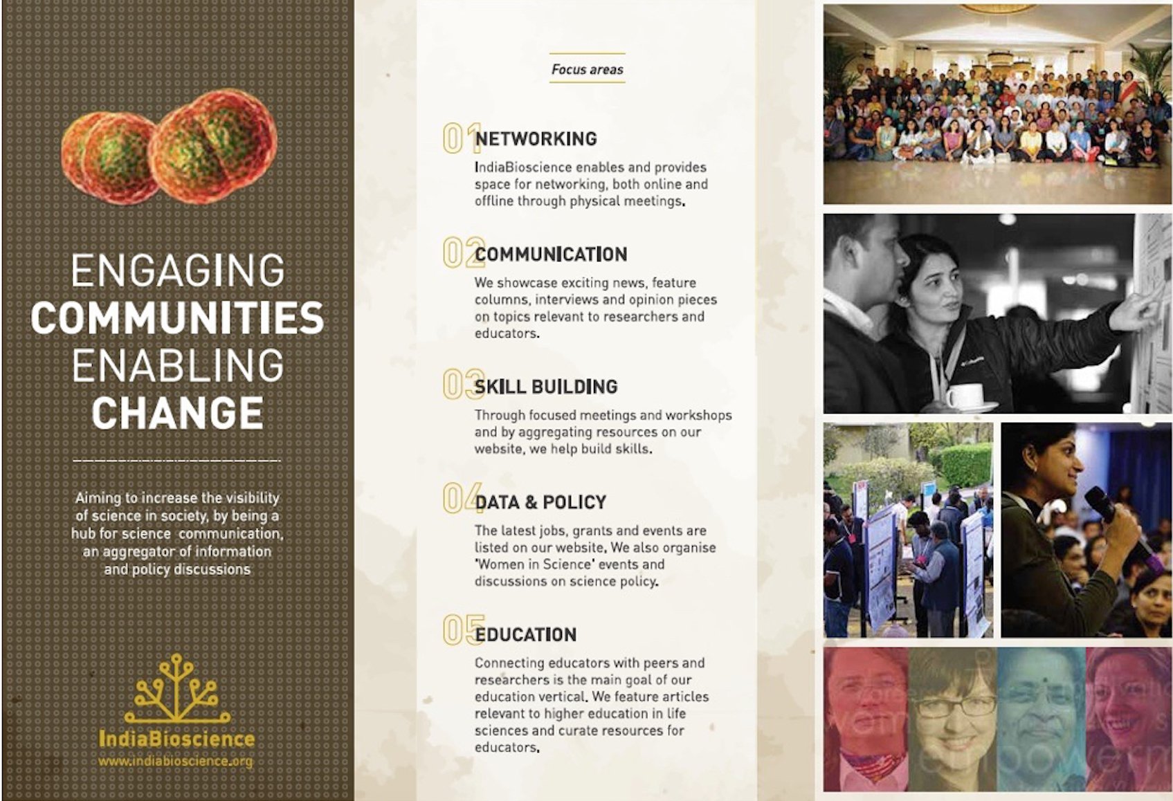 IndiaBioscience is a program that fills a unique niche in the ecosystem of the life sciences in India, by being a catalyst to promote changes that affect the culture and practice of the field, through engagement with academia, government, and industry at various levels.