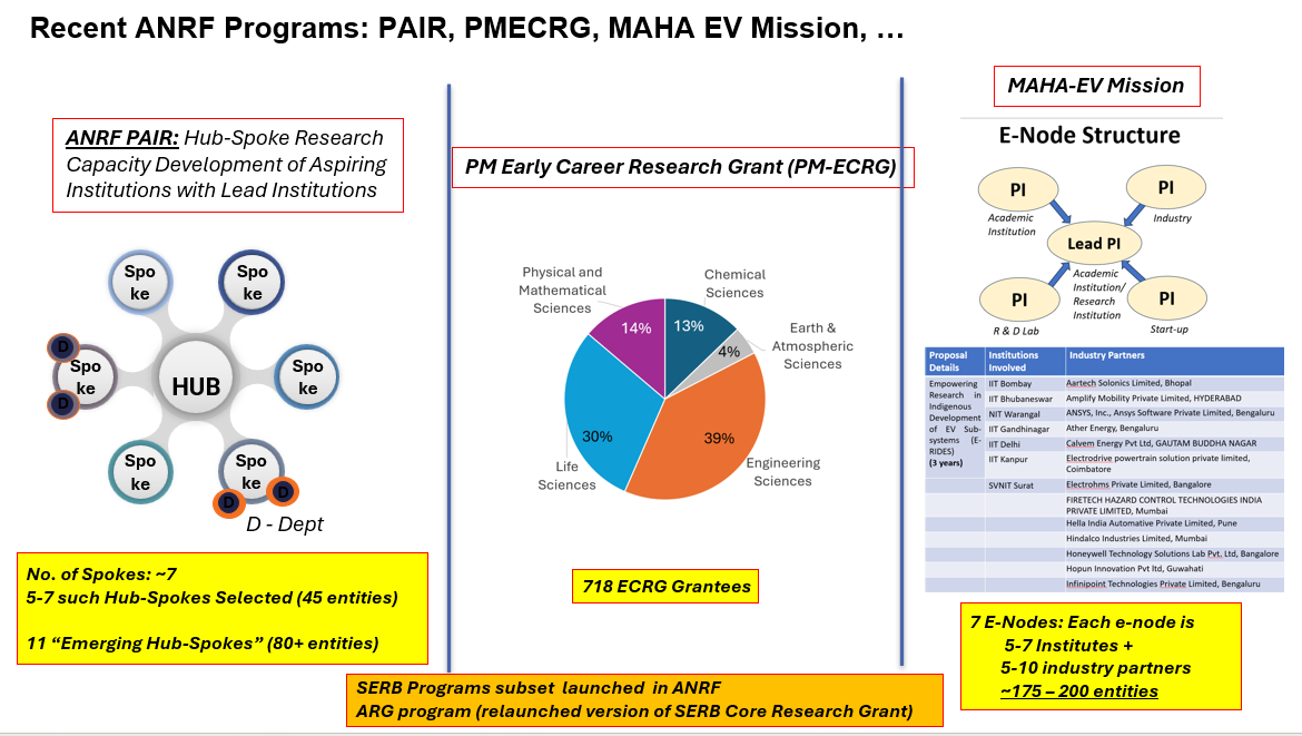 Ministry / Department or State Government: We welcome partnerships (with financial co-funding contributions) in any of our programs. Most of our MAHA mission mode programs are launched with anchor partners with one or more ministries/departments who are contributing to the outlay as well (eg: MedTech with ICMR, 2D Materials with MEITY, AI for S&E with MEITY, DRDO, MoES, DBT, CRM with Ministry of Mines, and Drones with MEITY, ICMR). If your department / ministry would like to partner with ANRF and leverage our investment in your sector using R&D, please reach out to me via your Secretary rank officer. Beyond central government, we would welcome state governments who would like to align some of their investments with our GoI central govt investments (eg: in PAIR program supporting many state universities or our mission mode programs in various sectors etc). I would request the Principal Secretary of the State Govt to please reach out to me.