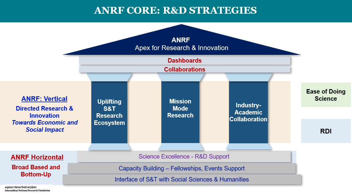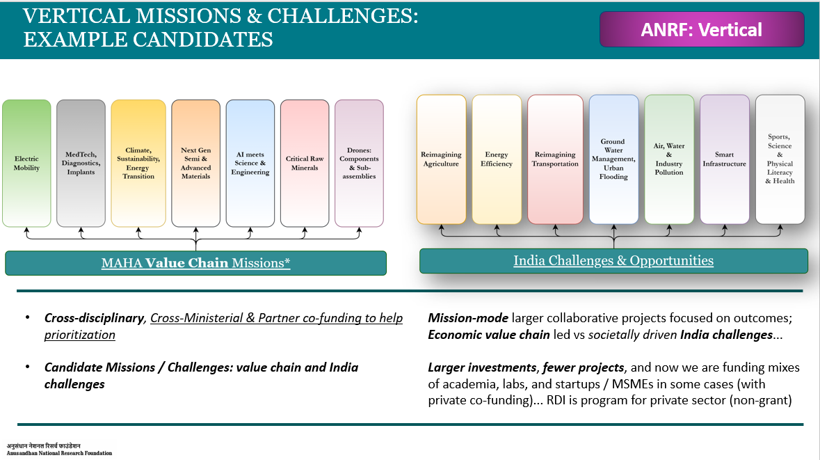By “horizontal” we mean broad based research, smaller projects (larger number of awards), individual fellowships, where we don’t tell investigators what to do, and instead evaluate their bottom-up ideas via expert committees. ANRF also supports humanities and social sciences (including management sciences & policy studies) at the interface of science & technology. A good analogy for this is how the National Science Foundation (NSF) drives broad based basic research investments in the USA.
