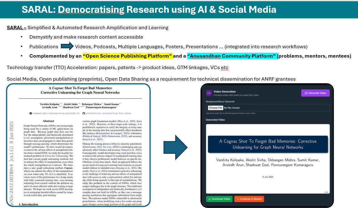 One example of this is the SARAL AI open source project ANRF is mentoring and closely collaborating with that helps democratize, demystify and diffuse knowledge at scale across language boundaries, and converting complex primary research into “SARALified” (simplified/demystified) secondary content in different forms (videos, Reels, podcasts, presentations, posters etc) automatically via AI in 19 different languages.