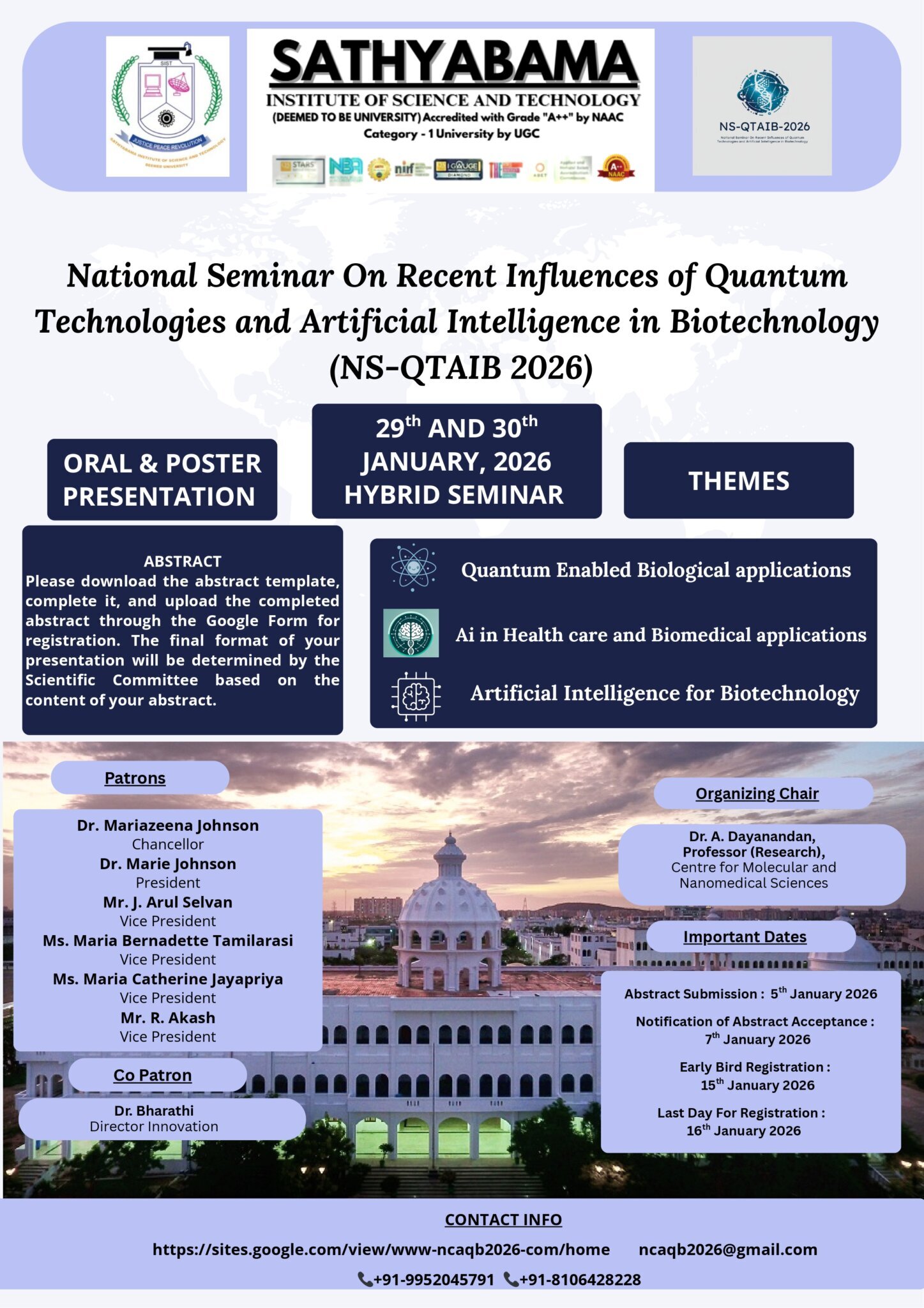 Sathyabama Institute of Science and Technology is organising a National Seminar on Recent Influences of Quantum Technologies and Artificial Intelligence in Biotechnology (NS – QTAIB 2026), scheduled to be held on 29th and 30th January 2026 in hybrid mode.