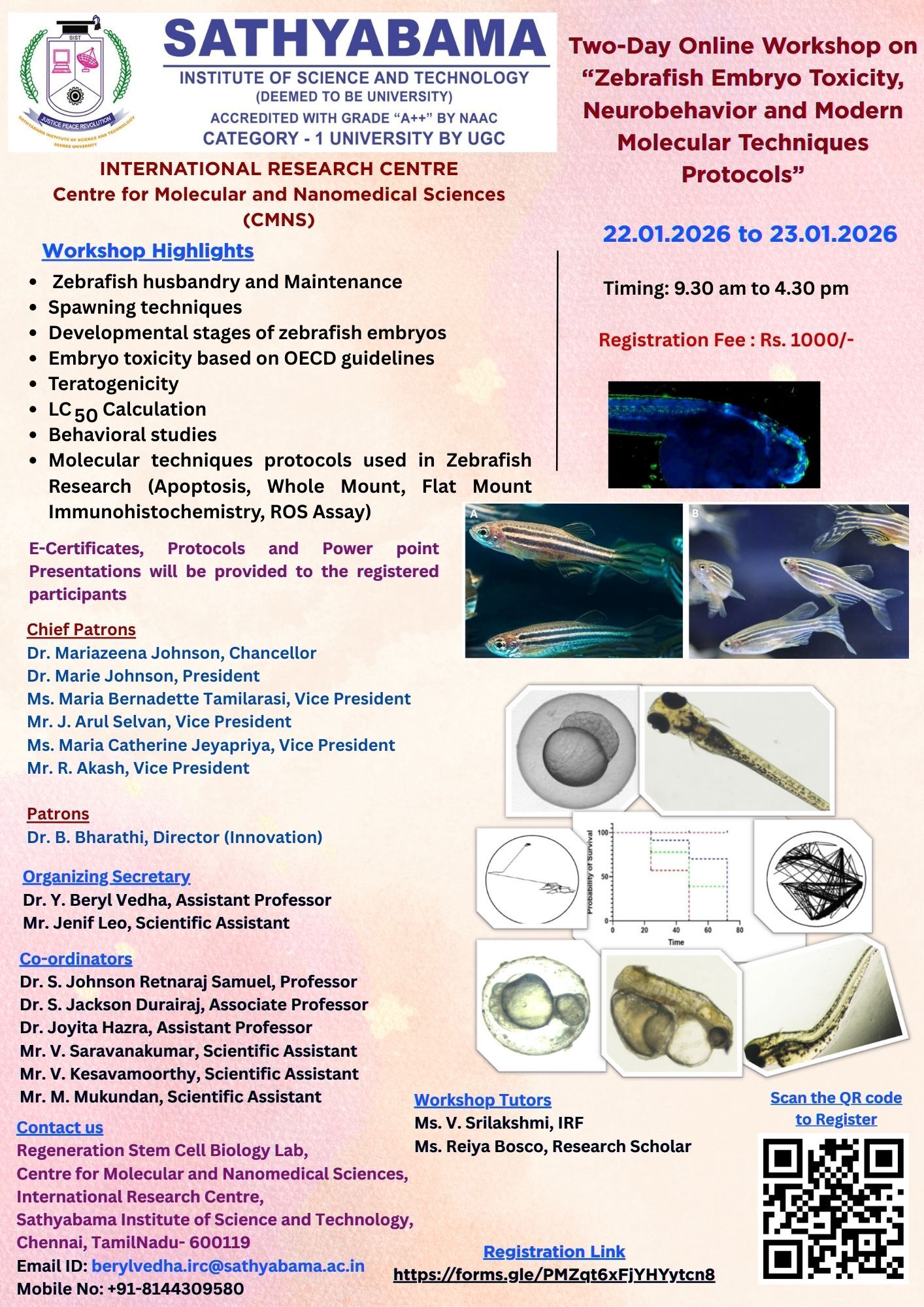 Sathyabama Institute of Science and Technology is organizing a Two-day online workshop on ” Zebrafish Embryo toxicity, Neurobehavior and Modern Molecular Techniques Protocols” on 22nd to 23rd January 2026 at 9.30 am to 4.00pm.