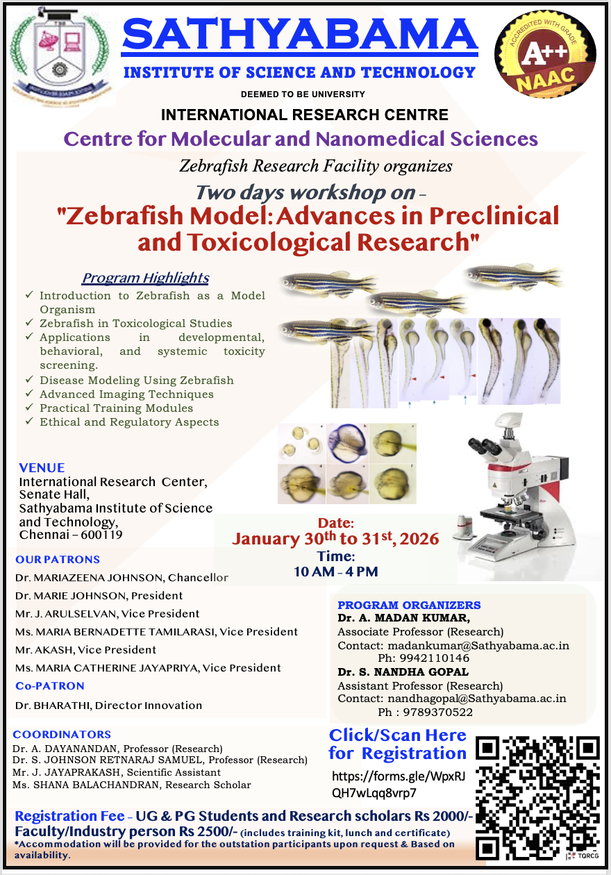Sathyabama Institute of Science and Technology is organising Two days workshop in “Zebrafish Model: Advances in Preclinical and Toxicological Research” which will be held on January 30th to 31st, 2026 at our Cancer biology lab, International Research Centre, Sathyabama Institute of Science and Technology, Chennai through Physical mode.