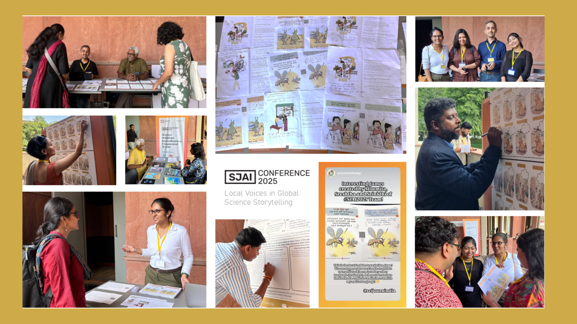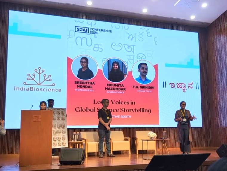 We were at the SJAI Conference 2025, where our colleagues Moumita and Sreshtha, along with Srinidhi from Enjana Trust, exhibited an interactive booth on Local Voices in Global Science Storytelling, exploring how science journalism and communication in Indian languages can thrive in the age of AI. Co-created by IndiaBioscience, Ejnana Trust, and the SJAI team, it invited delegates to play, translate, discuss, and reflect through creative activities like “Translate the Toon” and quick talks. The booth gathered insights on AI tools, linguistic diversity, and inclusive storytelling.