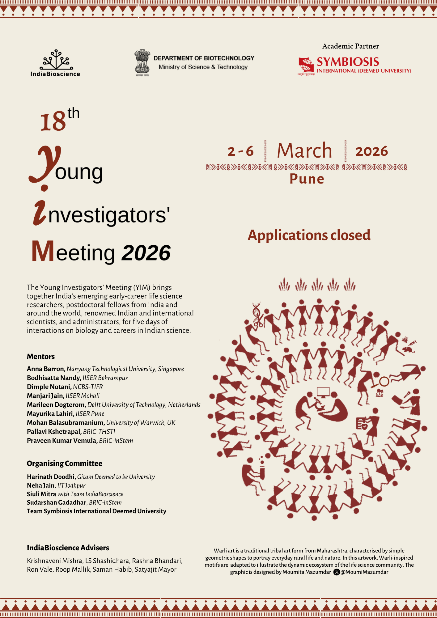 We are excited to announce that 40 Young Investigators and 40 Postdoctoral Fellow applicants have been shortlisted for the 18th Young Investigators’Meeting (YIM 2026). The applications for YIM 2025 are now closed, and preparations are in full swing for the upcoming Regional Young Investigator Meetings (RYIMs) in Mumbai (4–5 December 2025) and Tirupati (29–31 January 2026). Note the date change for RYIM Tirupati.