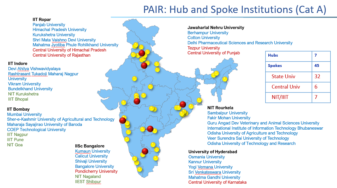 Another major class of “vertical” or focussed programs is the PAIR program, which is a hub-and-spoke approach to research capacity development and upliftment of aspiring institutions (including a large fraction of state universities) with hubs as top institutions. In the initial iteration, we have supported seven such networks including 45 spoke institutions. This is a more intensive and active capacity development driving collaboration, and with significant incentives for all parties. A map of institutions and the hub/spoke pattern is outlined in the pictures below. We will be complimenting these with PM Professorships in spoke institutions to drive mentoring and institutional development, research capacity development workshops, and technology platforms for driving collaboration, simplification / democratizing of research content for a broader set of institutions. There are also other initiatives such as One Nation One Subscription (ONOS) to help drive availability of research publications easily available for a large number of public institutions; and discussions are underway to enhance the coverage of this program in Phase 2.