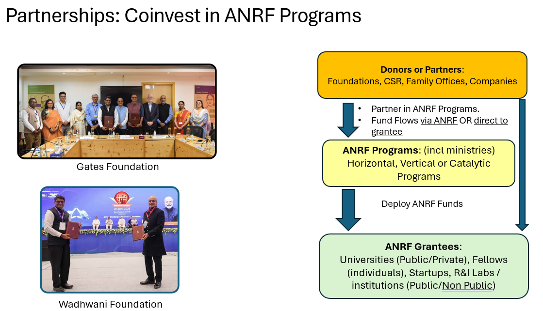 Foundation / Philanthropy / CSR / Family Offices: We welcome partnerships with Foundations. As per our ANRF Act 2023ANRF welcomes contributions to ANRF programs (either current or future). As mentioned in the figure above, ANRF designs, operates programs (horizontal, vertical, or in rare cases, catalytic programs) as approved by ANRF Executive Council in national interest. We welcome ideas for new programs that we can co-design with specific partners (at scale). Partners may partner with ANRF and they have capital allocation flexibility on which programs / projects / fellowships they can contribute to. We will be adding more ways for smaller contributions. Currently we are doing larger partnerships such as what we have done with Gates Foundation, Wadhwani Foundation. You may also bottom up partner with individual grantees or consortia which bid for ANRF programs (note that in this case, ANRF is not directly involved). We also welcome collaborative philanthropy where a credible entity serves as an aggregator of individuals, family offices, company CSR or foundations. If a credible counterparty emerges, ANRF will be open to partnering (and the contributions will get leverage because of the investments ANRF & GoI are making in specific sectors or programs).