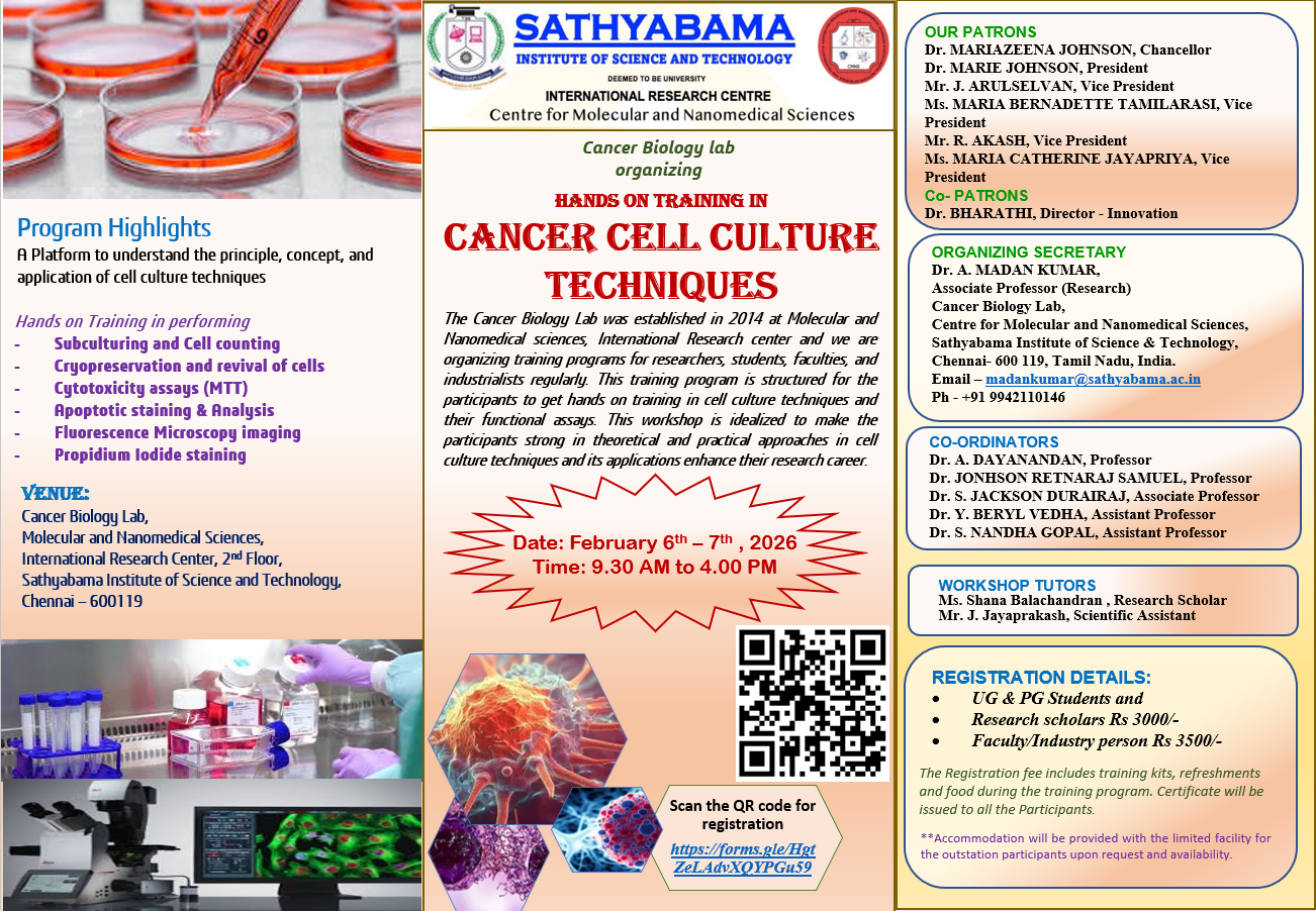 Sathyabama Institute of Science and Technology is organising Two days workshop in “Cancer cell culture techniques” which will be held on February 6th to 7th, 2026 at our Cancer biology lab, International Research Centre, Sathyabama Institute of Science and Technology, Chennai through Physical mode.