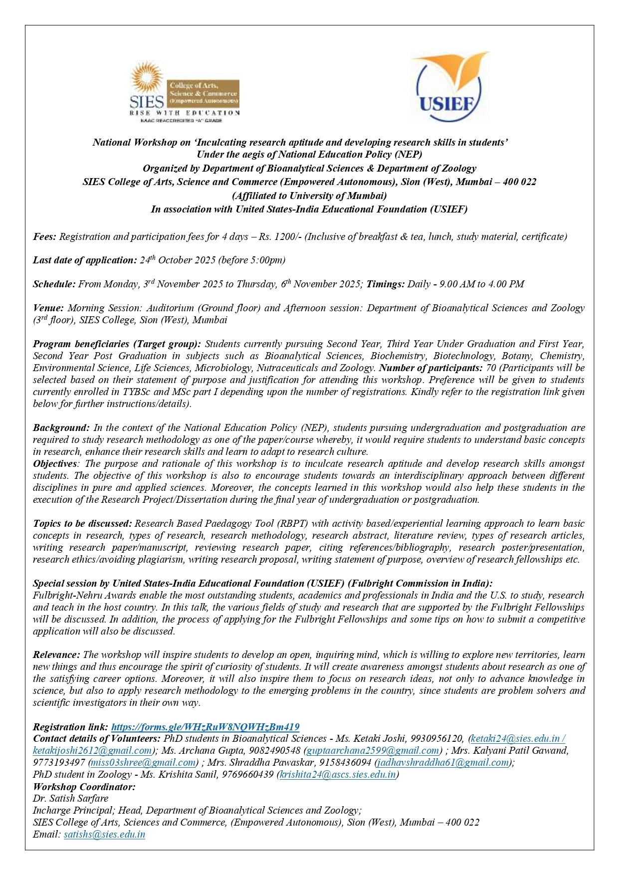 Program beneficiaries (Target group): Students currently pursuing Second Year, Third Year Under Graduation and First Year, Second Year Post Graduation in subjects such as Bioanalytical Sciences, Biochemistry, Biotechnology, Botany, Chemistry, Environmental Science, Life Sciences, Microbiology, Nutraceuticals and Zoology. Number of participants: 70 (Participants will be selected based on their statement of purpose and justification for attending this workshop. Preference will be given to students currently enrolled in TYBSc and MSc part I depending upon the number of registrations. Kindly refer to the registration link given below for further instructions/details).