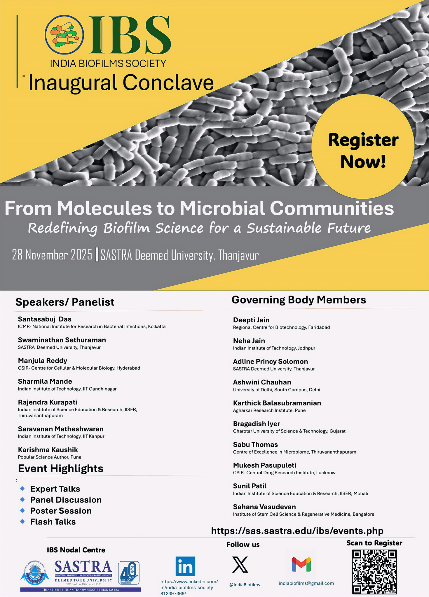 India Biofilm Society Inaugural Conclave 2025 will be held on 28th November 2025 at SASTRA Deemed University, Thanjavur, Tamil Nadu.