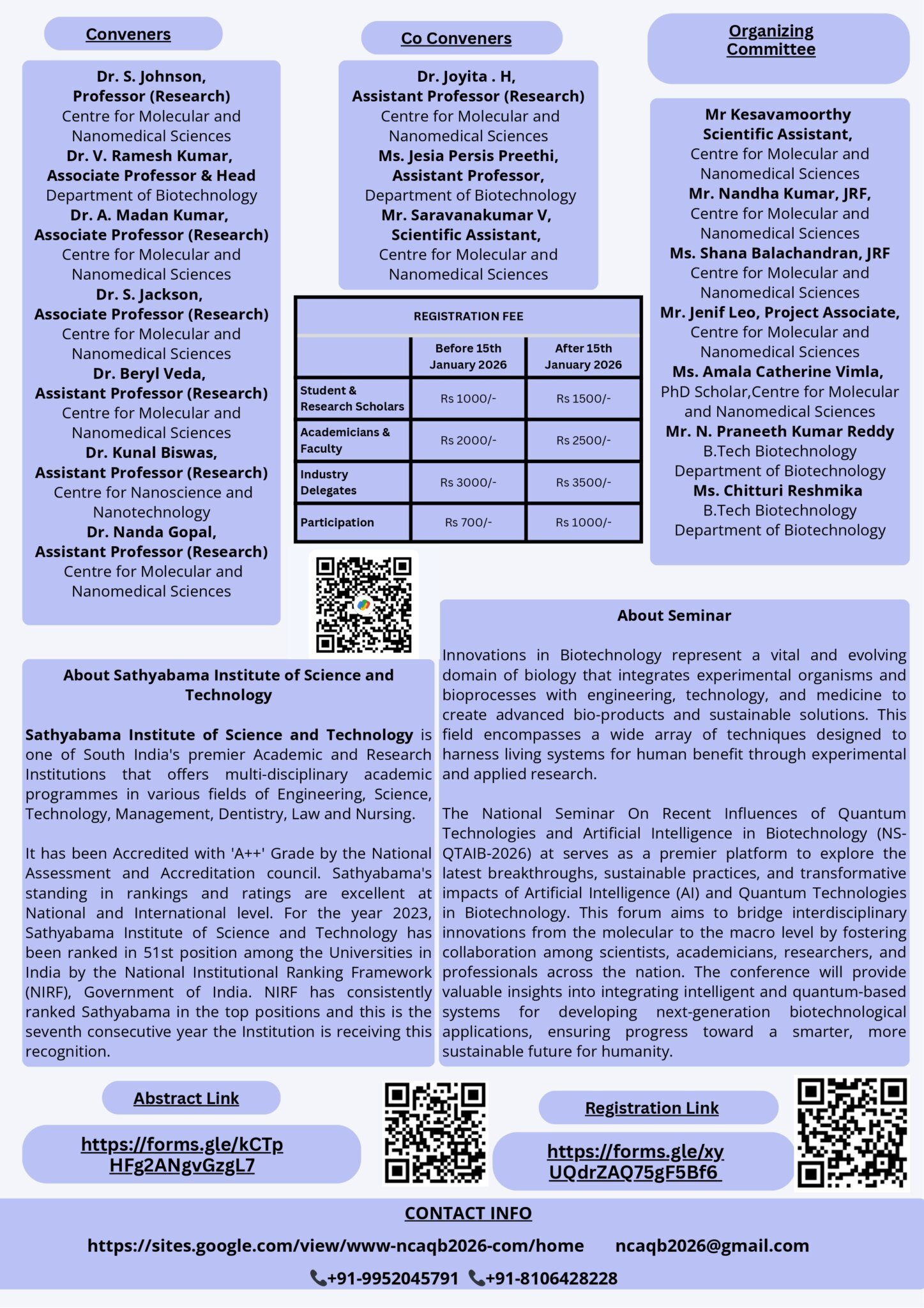Sathyabama Institute of Science and Technology is organising a National Seminar on Recent Influences of Quantum Technologies and Artificial Intelligence in Biotechnology (NS – QTAIB 2026), scheduled to be held on 29th and 30th January 2026 in hybrid mode.