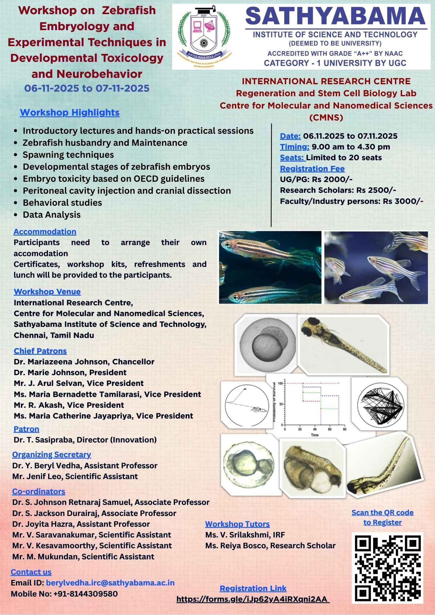 Sathyabama Institute of Science and Technology is organising a workshop on “Zebrafish Embryology and Experimental Techniques in Developmental Toxicology and Neurobehavior” from 06th- 07th November, 2025 at Sathyabama Institute of Science and Technology, Chennai.