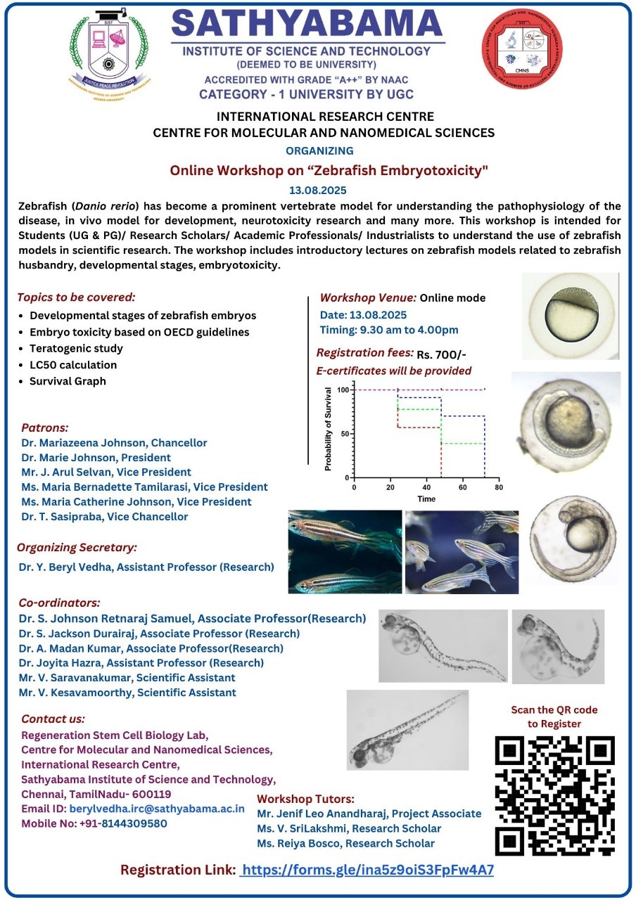 Sathyabama Institute of Science and Technology is organising an online workshop on “Zebrafish Embryotoxicity” on 13th August 2025 from 9.30 AM to 4.00 PM.